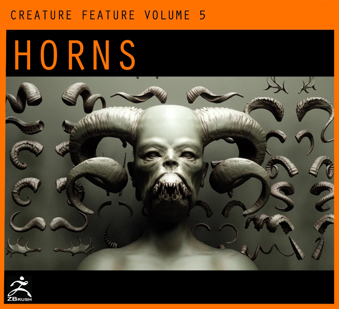 A collection of 60 highly detailed creature components designed for character and monster creation. The set includes a variety of anatomical features: 39 standard horns, 9 specialized horns, 5 frills, and 7 horn sockets. While primarily packaged as ZBrush IMM and VDM brushes, the collection provides FBX and OBJ files of all meshes, allowing the components to be imported into Blender as standard kitbash assets for concept art and detailed sculpting workflows.