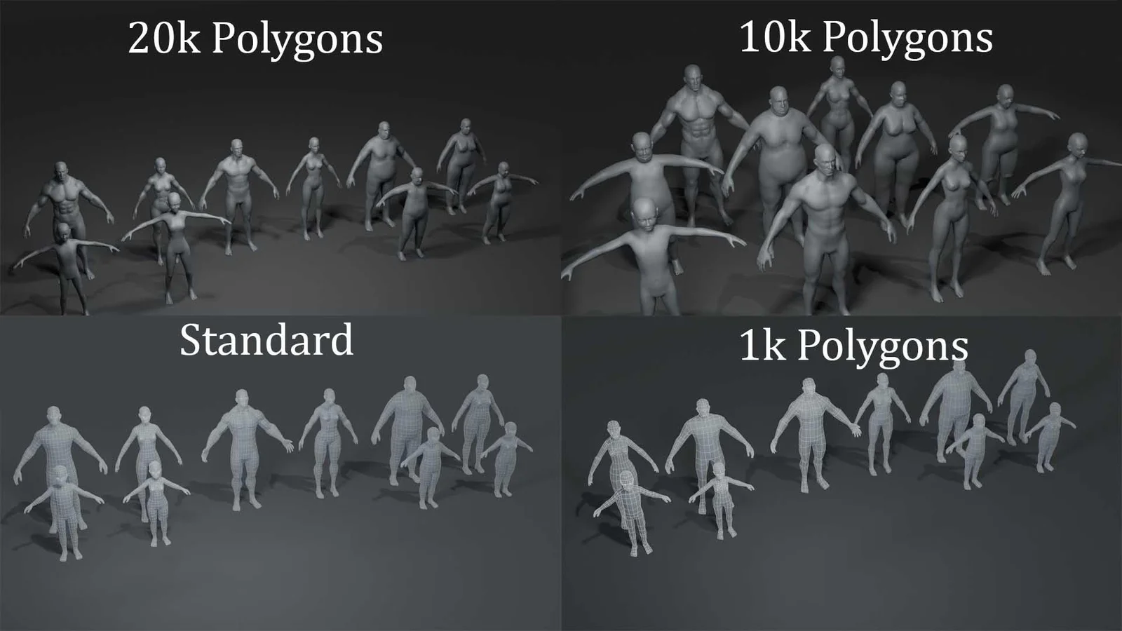This collection includes 40 human base mesh models, organized across four distinct polycount levels: 1k, standard (approx. 2.3k), 10k, and 20k polygons. The pack covers a variety of body types including average male and female, boys and girls, superhero/muscular builds, and fat variations for both adults and children.