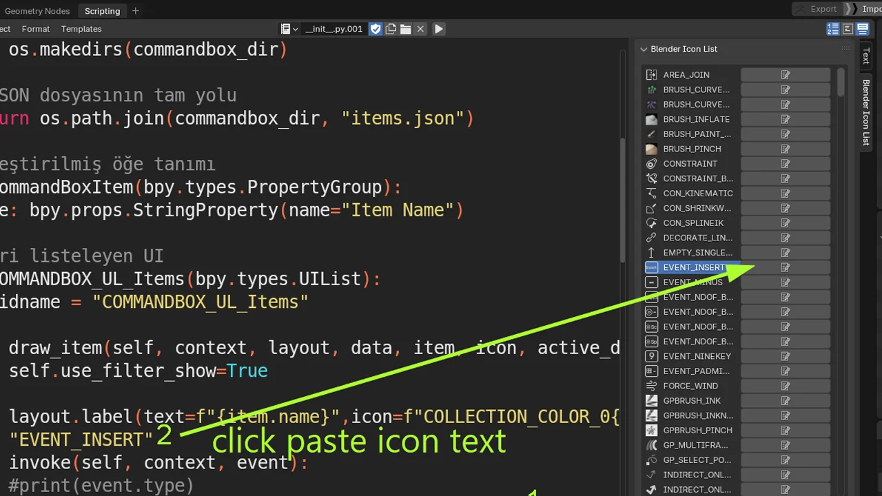 This development tool provides a visual interface for browsing all internal Blender UI icons. It displays each icon alongside its corresponding string name, making it easier to reference them when building custom panels and menus. The tool includes a search filter to quickly locate specific icons. Developers can use a dedicated button to paste the selected icon's name directly into the active script within Blender's Text Editor.