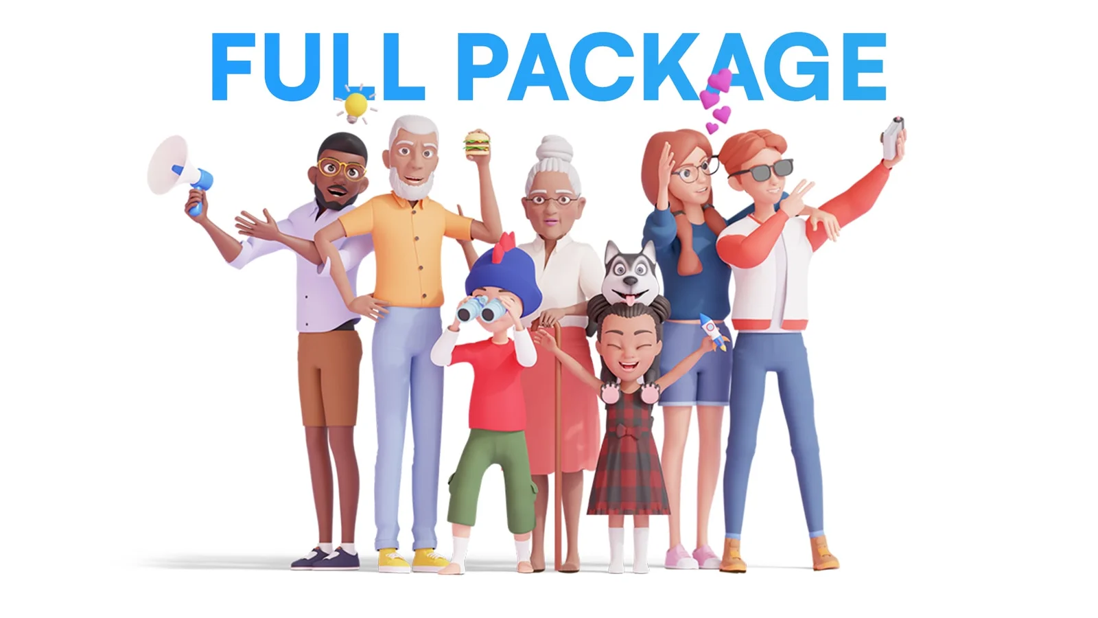 A comprehensive library of modular 3D characters, including adults, kids, elders, muscular figures, and pets. The collection features diverse options for skin tones, hair styles, clothing, accessories, and poses. Each character includes full body and facial rigs for animation and posing. The package also provides a Blender generator and randomizer script to quickly assemble customized or randomized characters. Additionally, it includes five distinct 3D scenes with various objects and thousands of pre-rendered PNG images.
