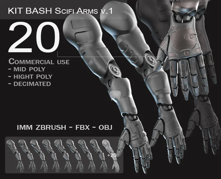 A collection of 20 unique sci-fi arm models designed for character concepting and kitbashing. The models are provided in both low-poly and high-poly versions with pre-made UV maps, enabling immediate baking workflows in external texturing software. The geometry is grouped to facilitate easy articulation and posing, and the default scale is mapped to standard mannequin proportions.