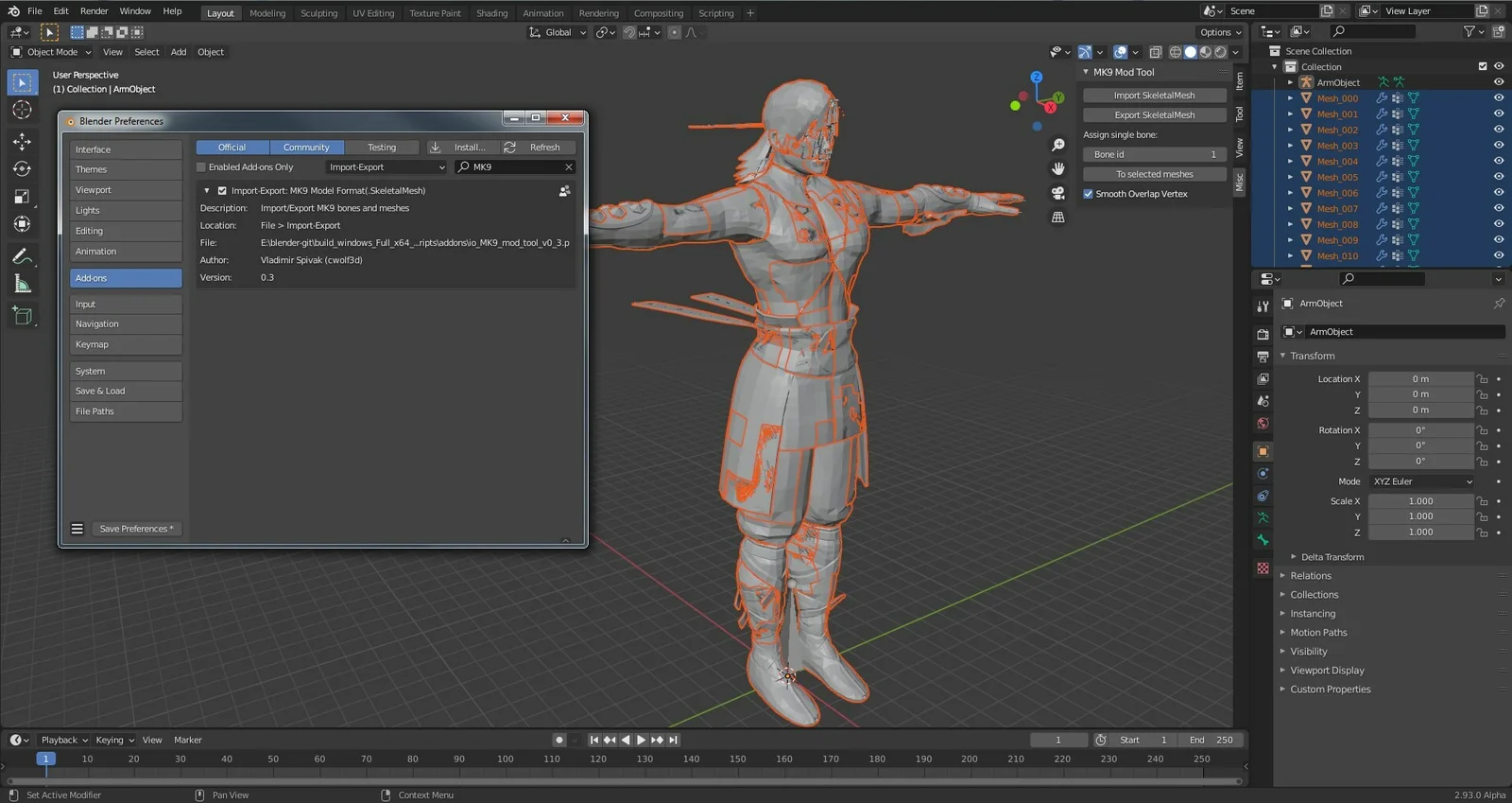 This add-on provides import and export support for the Mortal Kombat 9 (MK9) .SkeletalMesh model format. It allows users to bring MK9 meshes into Blender for modification and export them back into the game's native format.
