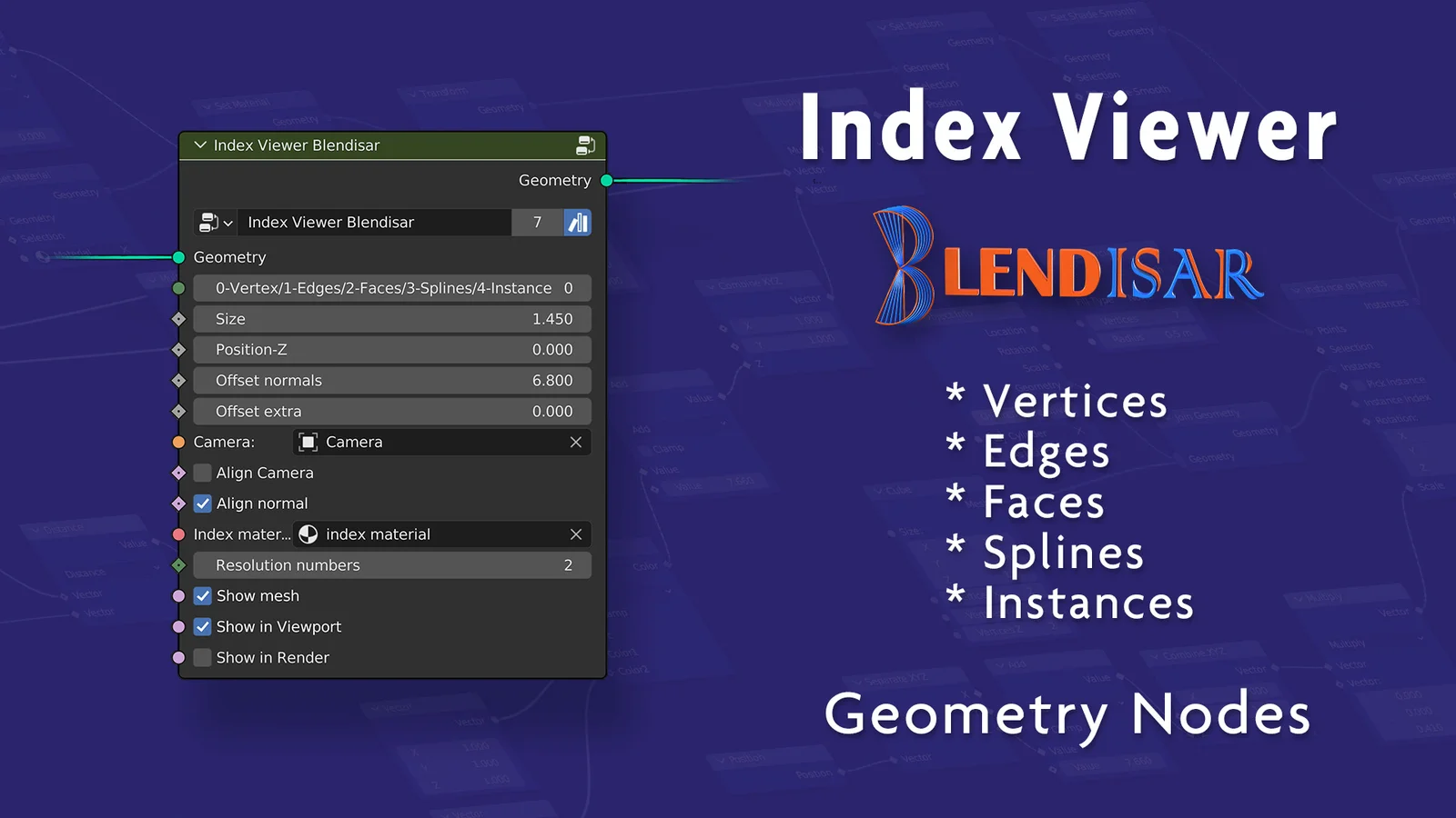 This Geometry Nodes setup allows users to visualize the index numbers of vertices, edges, faces, splines, and instances directly on their models. The tool provides customizable inputs to adjust the size, Z-position, and normal offsets of the displayed numbers to ensure visibility across different surface types.