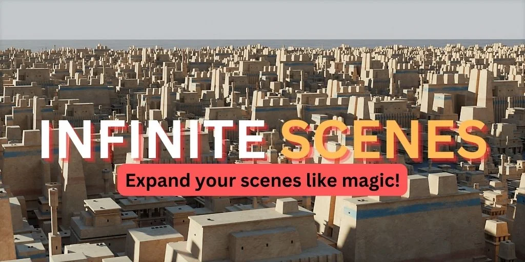 Infinite Scene is a Geometry Nodes setup for rapidly expanding small environments by creating instanced duplicates of existing scene elements. By referencing a specified object collection, the setup generates an expansive area without relying on duplicated geometry, maintaining performance overhead closer to the source scene.