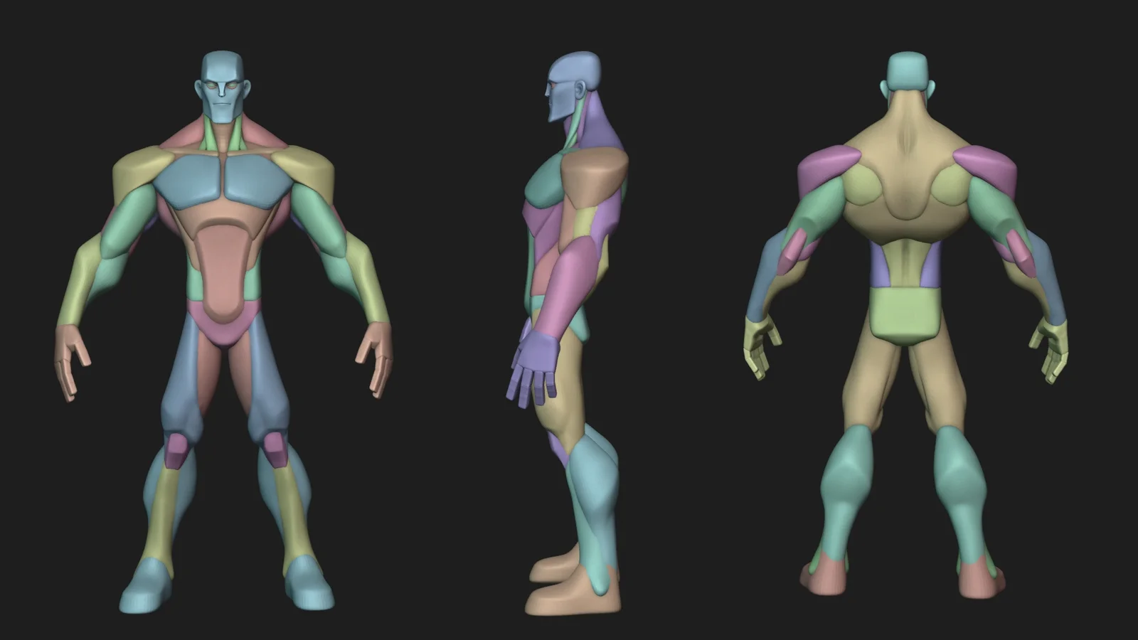 A stylized anatomy blockout model designed as a foundational base for developing hero and warrior characters. The model consists of separate anatomical components, including the head, torso, arm, hand, leg, and feet, allowing for modular adjustments during the modeling process. It is provided in native Blender format alongside standard exchange formats for easy integration into character creation workflows.