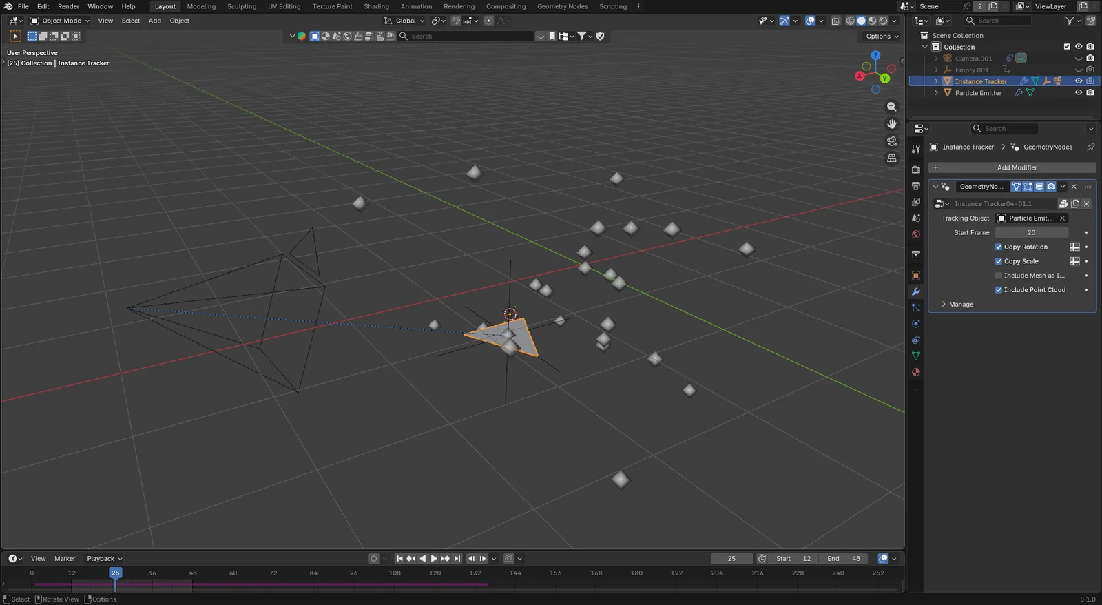 Once the Empty is constrained, you can attach child objects like cameras for POV shots, lights, or particle effects directly to the moving instance. The system synchronizes location, rotation, and scale in real-time. It supports standard instances, realized meshes, and raw point clouds using a purely node-based workflow.