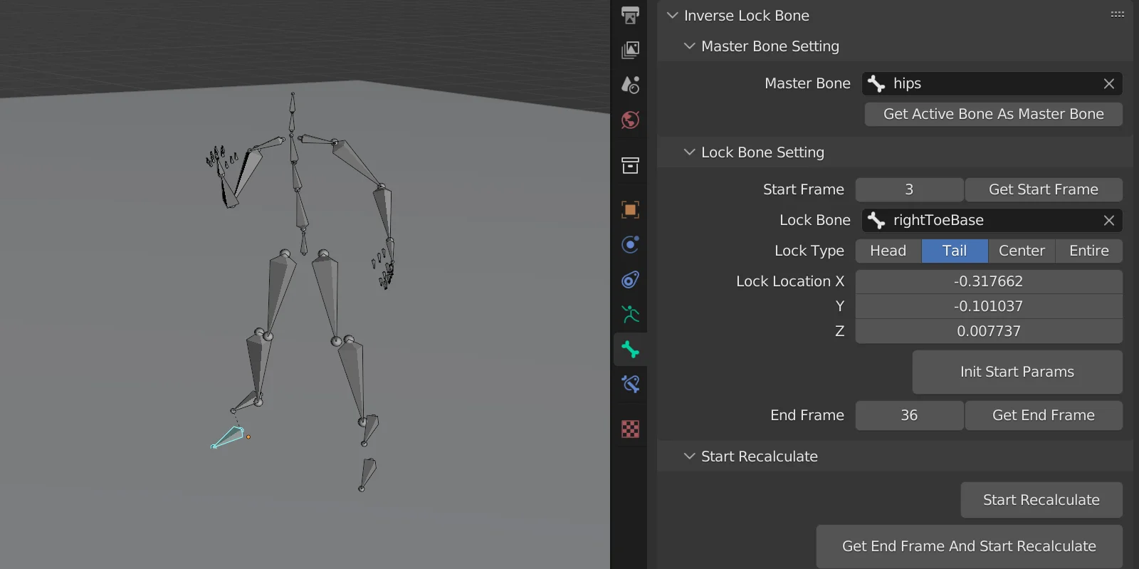 Inverse Lock Bone is an animation tool designed to fix foot sliding issues commonly found in motion capture data and manual keyframing. It works by locking a specified target bone, such as a toe or foot, and automatically recalculating the transform data of the rig's master or root bone to maintain that locked position.