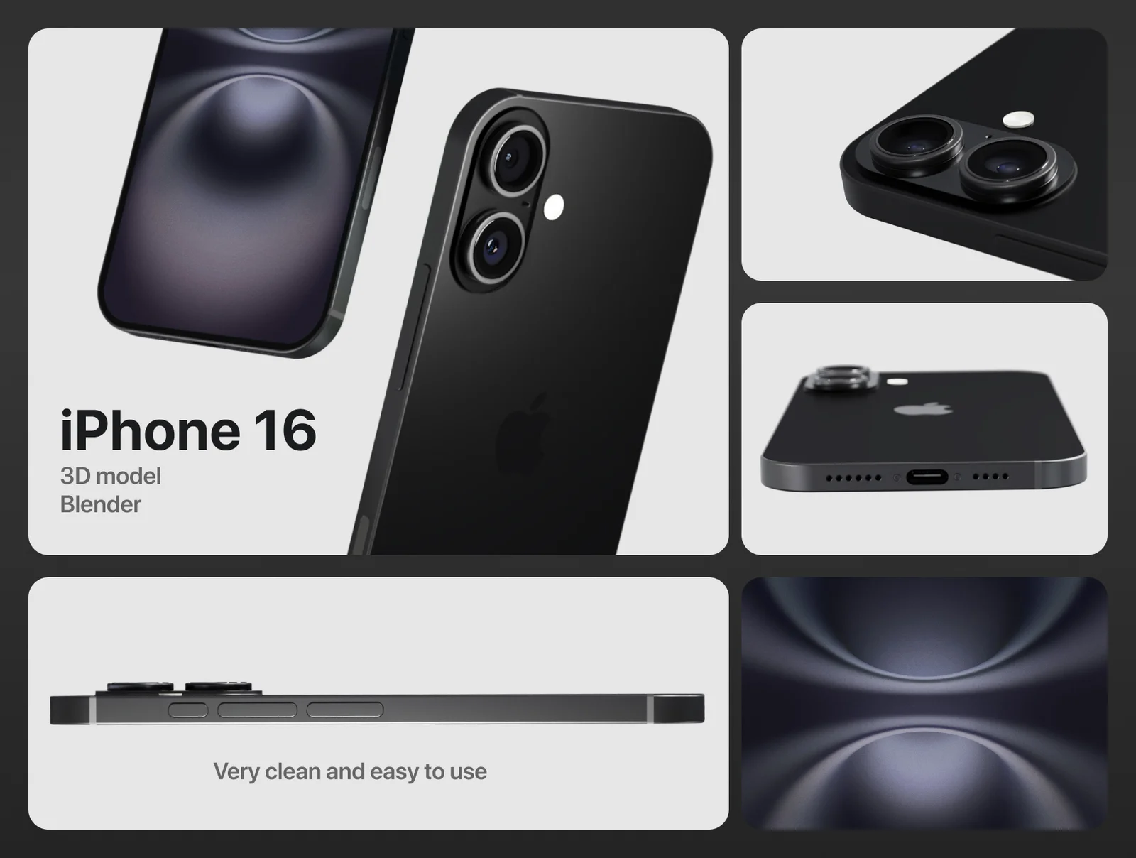 This product provides a high-resolution 3D model of an iPhone 16. It is designed for use in application mockups, product displays, and technology branding. The asset is prepared for immediate rendering and is supplied in both native Blender and FBX file formats.