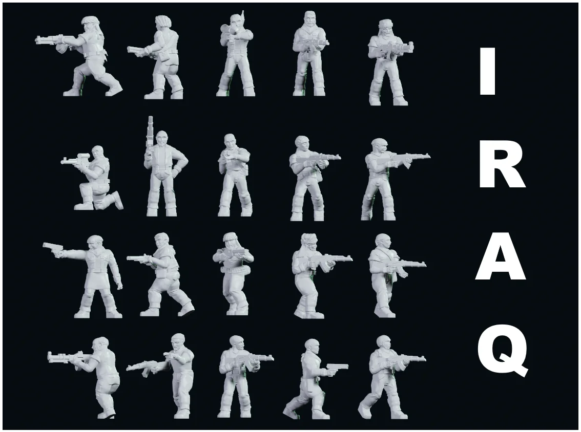 This product provides a collection of 3D printable miniature figures depicting Iraqi insurgents. The models are scaled to 1/100, resulting in figures that are approximately 18mm tall.
