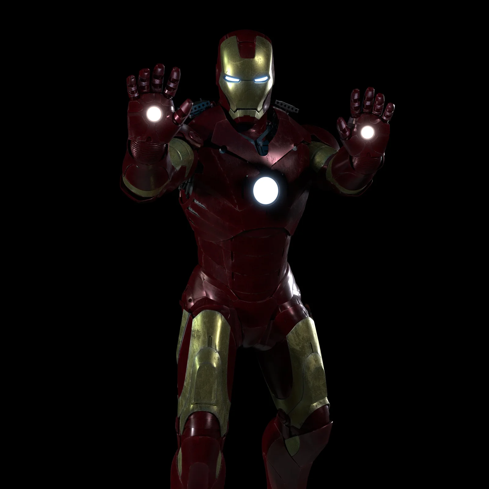 This is a detailed 3D model of the Mark III armor from the Iron Man films, provided as a native Blender file. The character is fully textured and includes a modeled under-layer along with integrated weapons. The provided armature uses both Inverse Kinematics (IK) and Forward Kinematics (FK) for animation, incorporating mechanical rigging features tailored to the suit. The file also comes with a library of 14 pre-made pose assets.