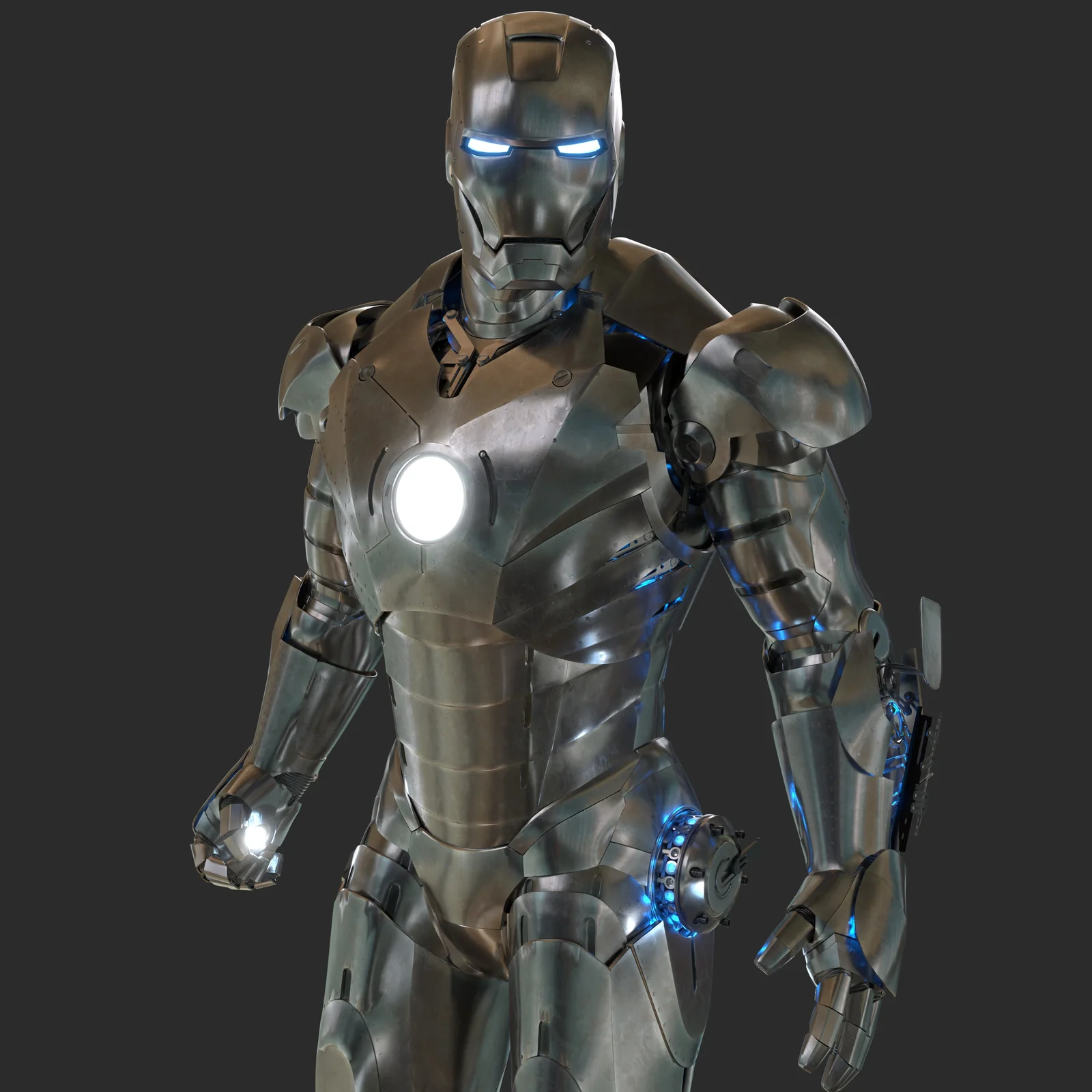 This product provides a detailed, textured 3D character model of the Iron Man Mark II suit created for Blender. The model features a comprehensive rigging system equipped with both Forward Kinematics (FK) and Inverse Kinematics (IK) controls, built with armature mechanisms to handle mechanical articulation.