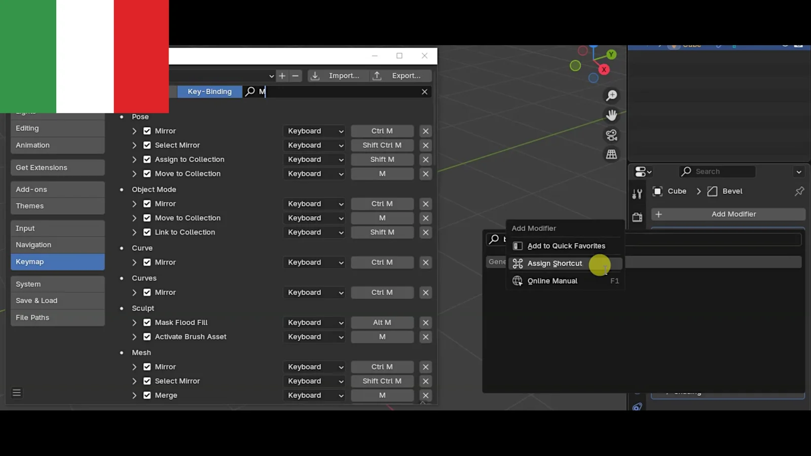 This is an Italian-language PDF guide detailing how to set custom shortcuts in Blender, specifically for version 4.3. The guide covers the basic process of customizing keyboard shortcuts and addresses potential difficulties that may arise during the configuration process.