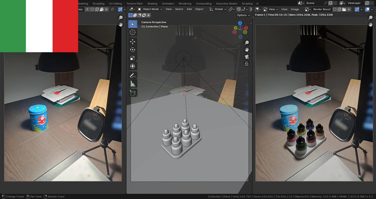This Italian-language PDF tutorial covers the second part of a photo-insertion project in Blender. It explains how to use the Shadow Catcher feature to project 3D model shadows onto a background plane and integrate them into the final render using Blender's compositor. The guide builds upon previous steps involving camera matching and object placement using the fSpy add-on.