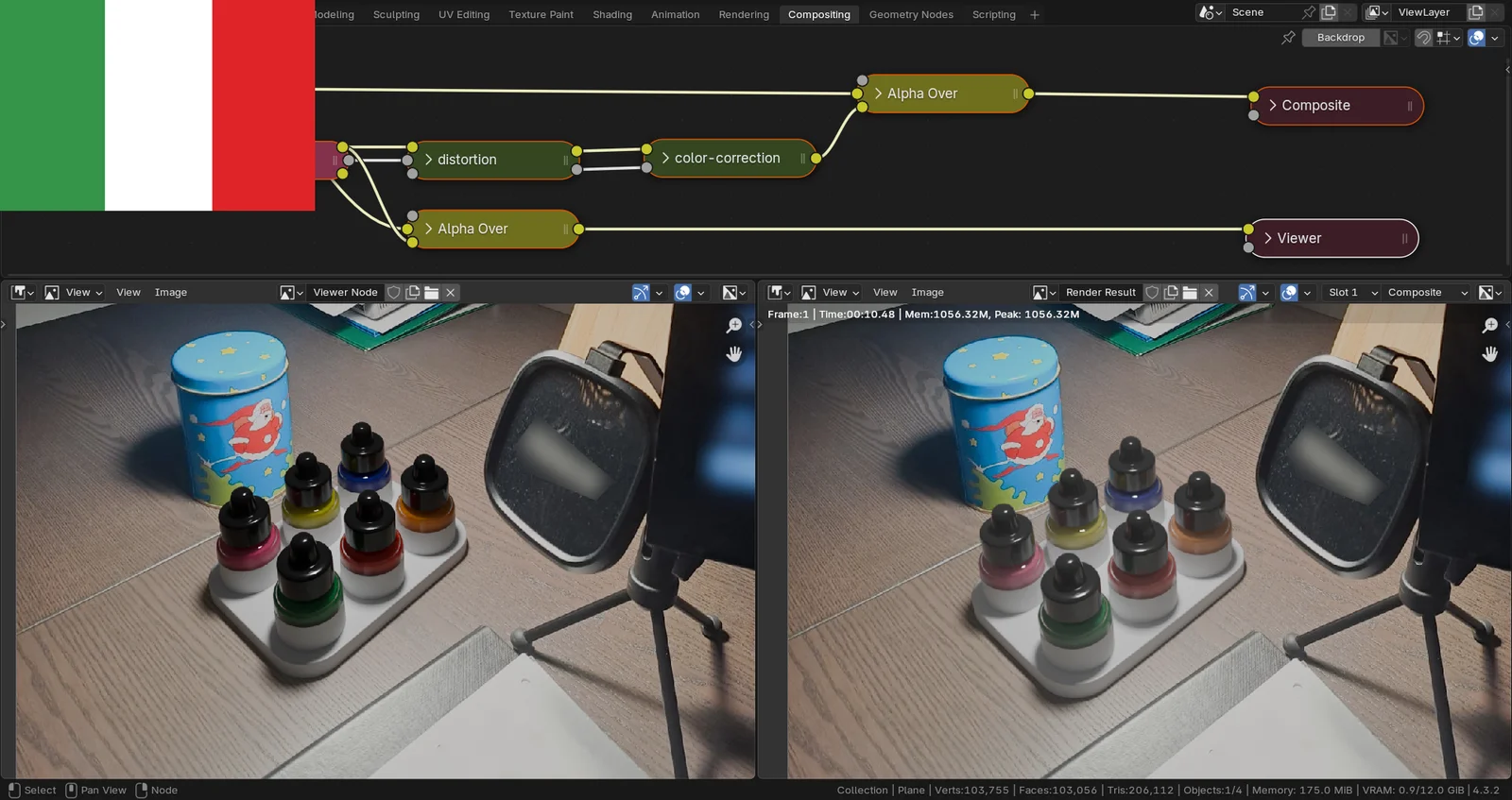 This Italian-language PDF guide is the third part of a series focused on integrating 3D models into photographs using Blender. The tutorial covers compositing workflows, demonstrating how to modify the 3D model's appearance through color correction. It also details the implementation of lens distortion and explains how to extract and process the Shadow Catcher pass for realistic shadow integration.