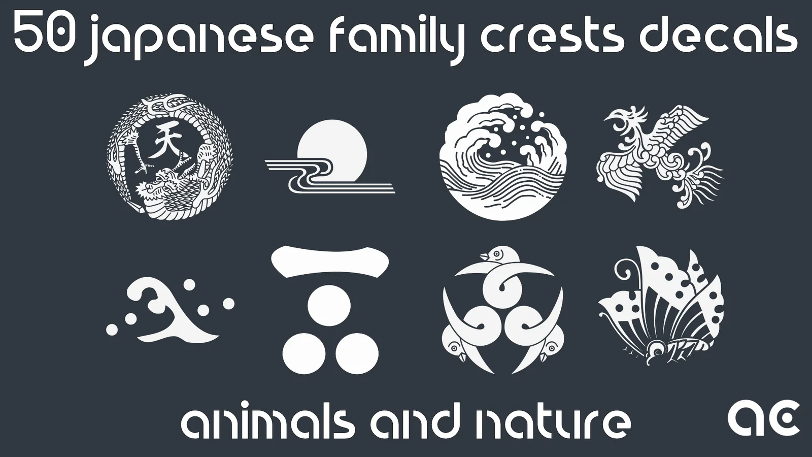 This collection provides 50 alpha decals featuring animal and nature-inspired Japanese family crests, also known as Kamon. These emblems can be applied to models during the sculpting or texturing process to add culturally specific detailing. The collection focuses on the most recognized crest designs within the animal and nature themes.