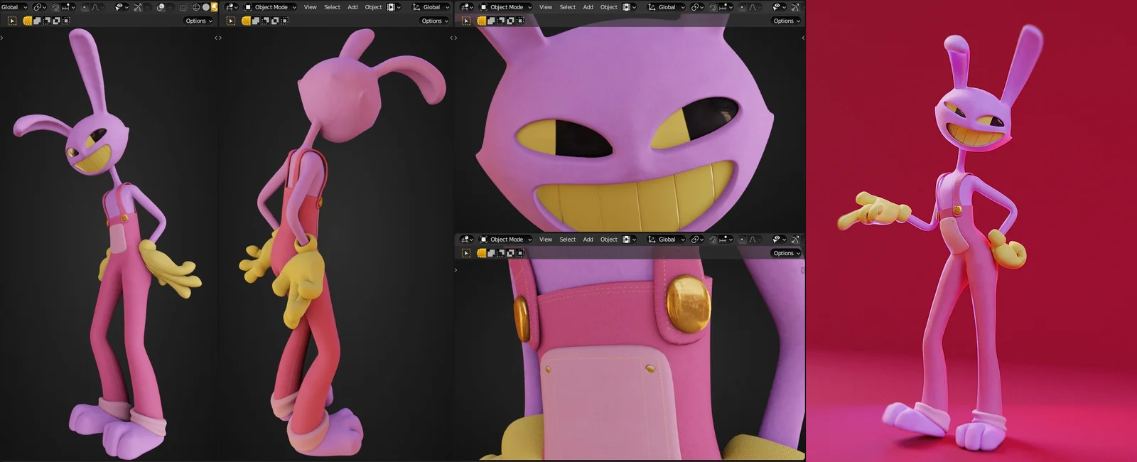 A fan-made 3D character model of Jax from The Amazing Digital Circus, fully rigged for animation. The rig utilizes Auto-Rig Pro for body mechanics and Faceit for facial expressions. The Faceit Rig Tools addon is required to utilize the facial rig functionality within Blender. An FBX format is also included for use in other 3D applications and game engines.