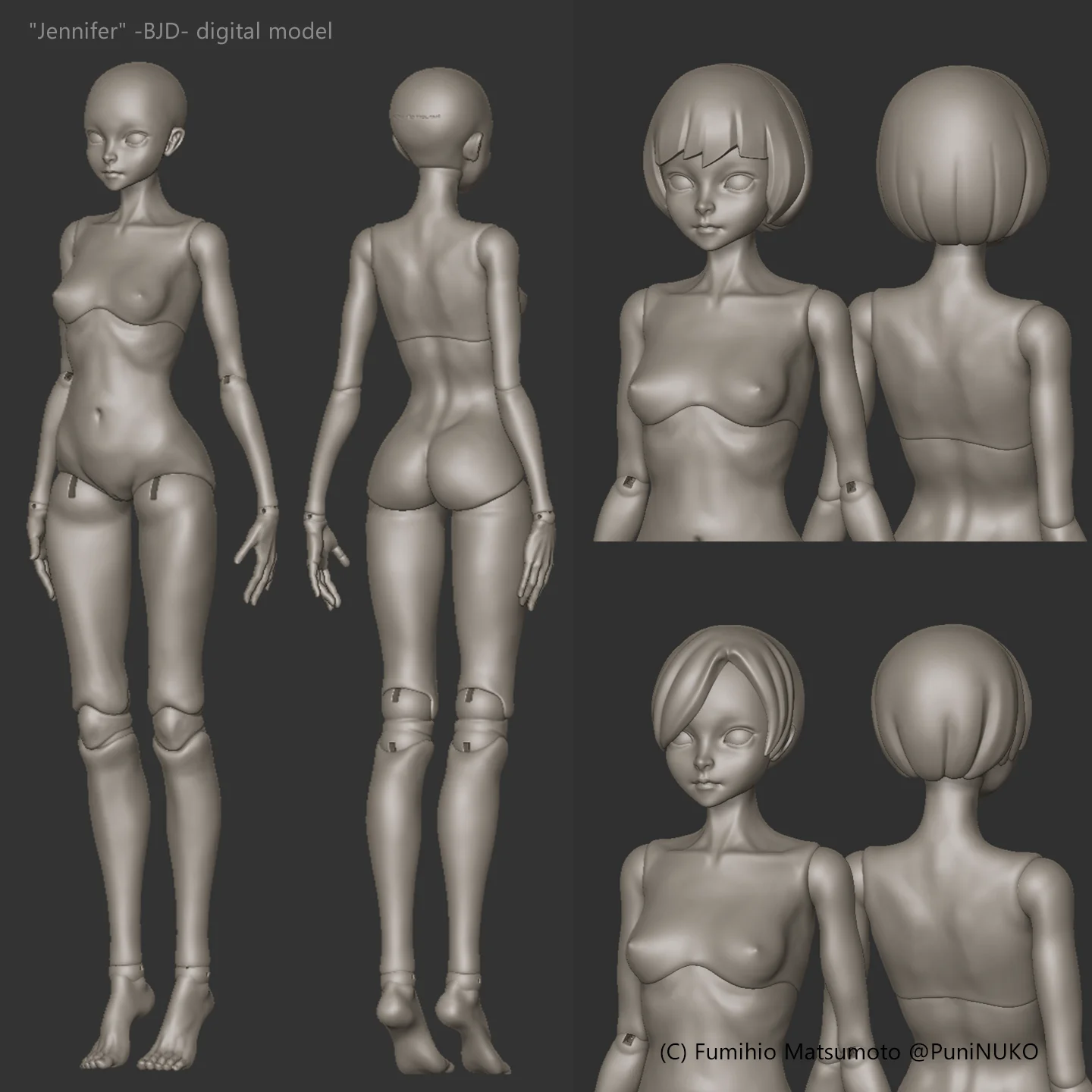 A digital model of a ball-jointed doll, designed specifically for resin 3D printing. The model is scaled for a 29cm print size and comes as separated STL files, including the torso, limbs, joints, head, hands, feet, structural parts, multiple hair options, and eyes.