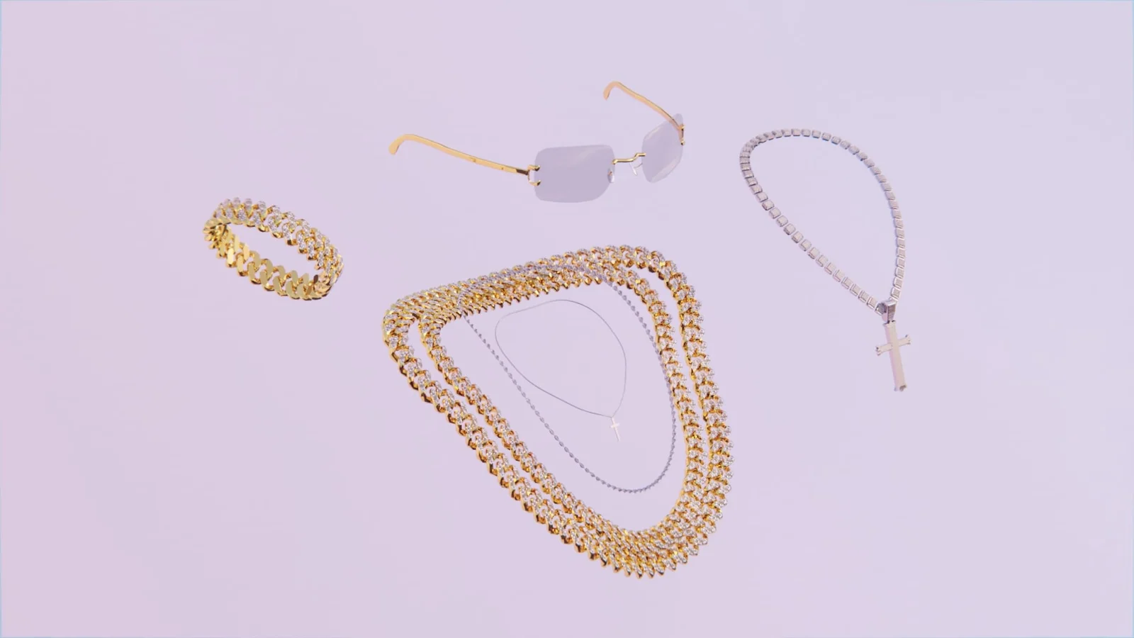 This collection provides a variety of 3D models focused on jewelry and wearable accessories. The set includes two sizes of a gold and diamond chain, a matching gold and diamond bracelet, and a pair of sunglasses. Additional pieces include a DNA helix chain, a small cross necklace, and a large square chain cross necklace. The combined assets contain approximately 47,100 vertices.