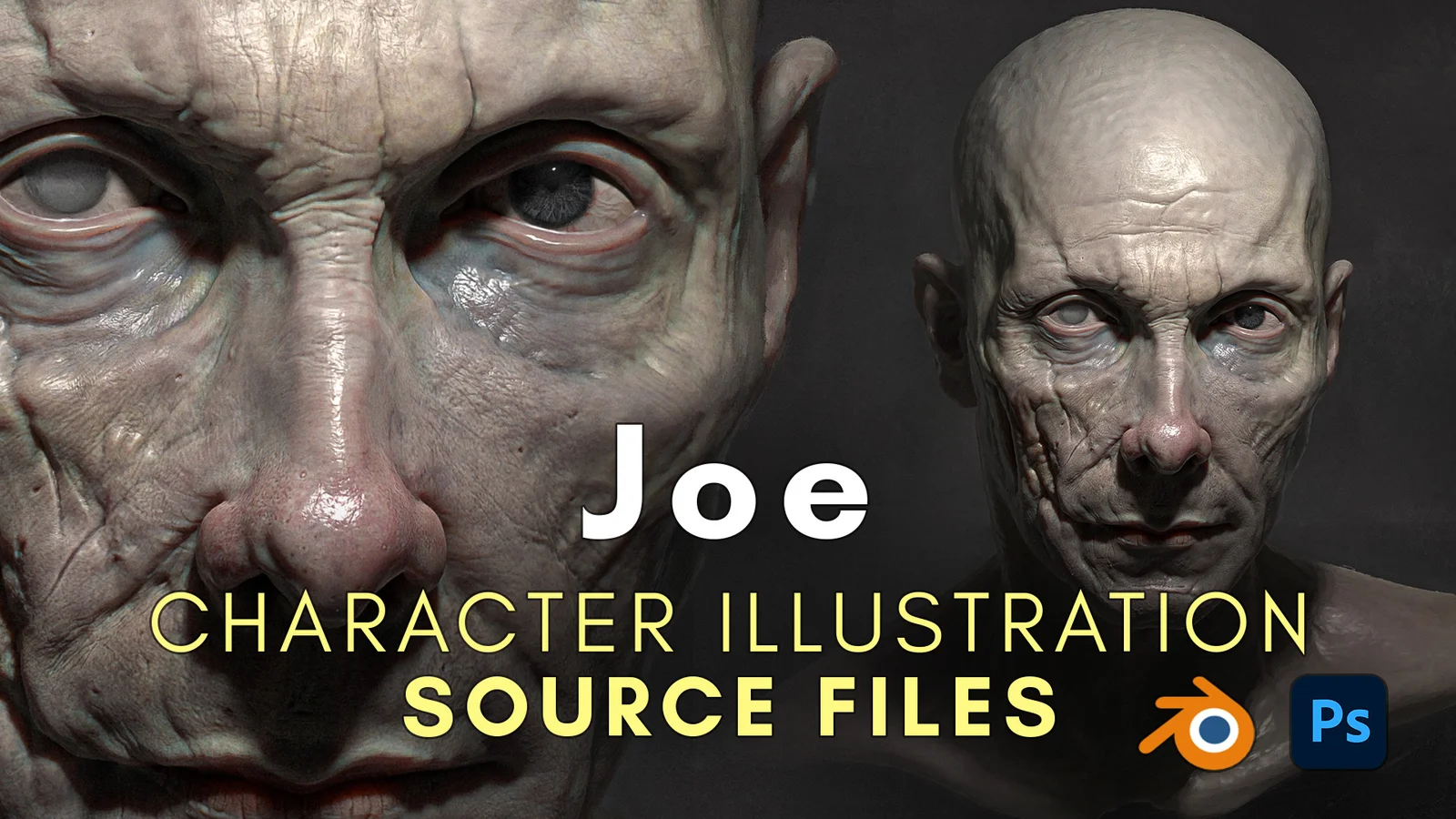 This product contains the complete Blender and Photoshop source files for a character illustration named Joe. The included .blend file provides the fully colored and textured character model within its original scene build. The geometry consists of approximately 7.4 million faces and makes use of Blender's attribute painting system.