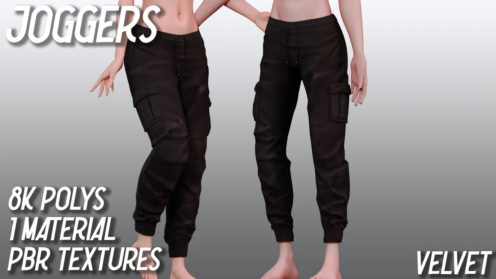 A 3D model of jogger pants featuring an 8,000 polygon count and a high-to-low poly bake. The asset includes a single material with PBR texture maps and comes rigged to the Crabman slim male and Lunarreef bases.