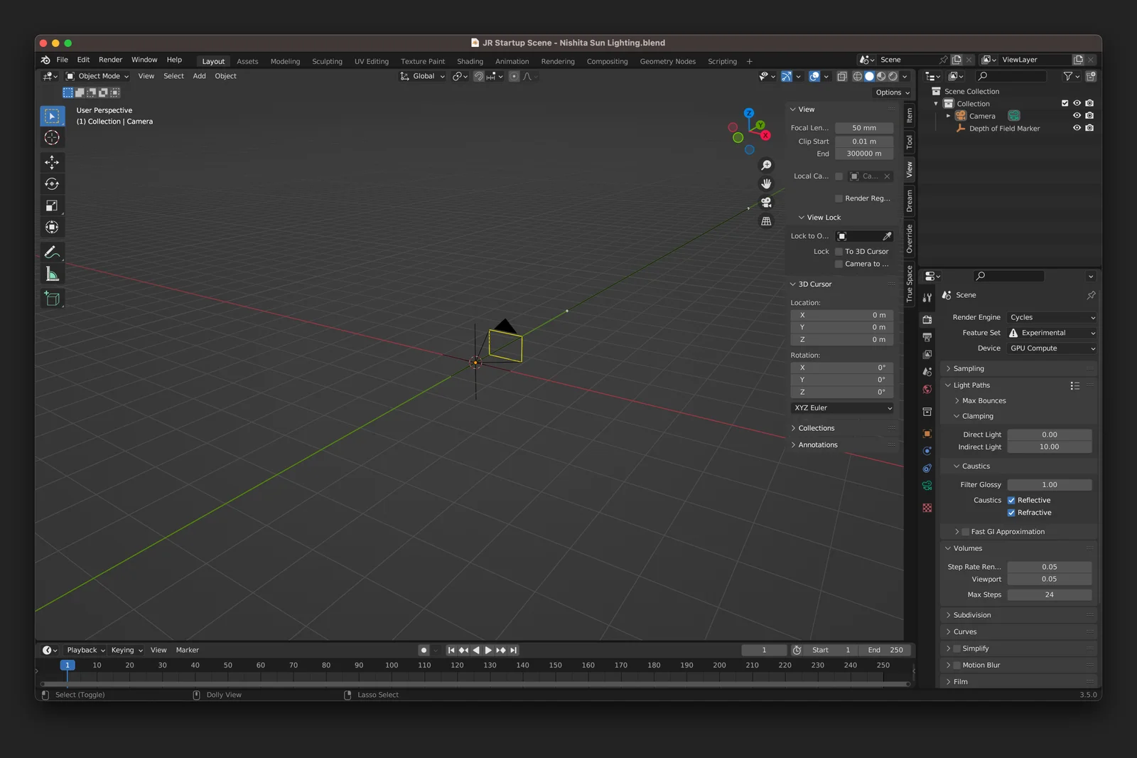 A collection of customized Blender startup files optimized for Cycles rendering. These scenes adjust default settings to improve workflow for large environments and volumetrics. Modifications include increased clipping planes, optimized volume rendering steps, increased transparent bounces, and high contrast filmic color management.