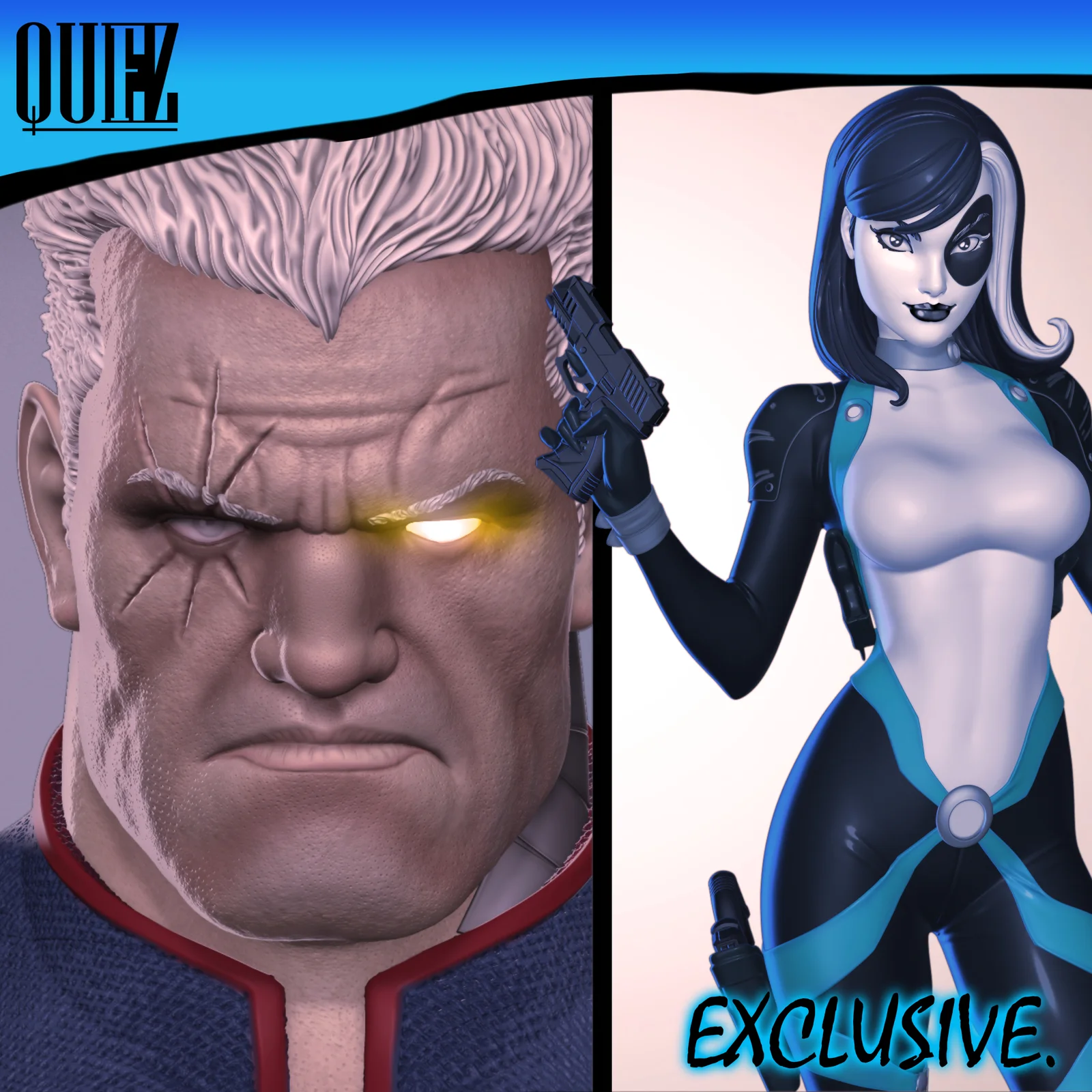 A set of 3D printable character models featuring Domino and a Cable bust. The Domino figure is designed in the art style of comic book artist J. Scott Campbell, scaled at 1/6 and measuring 324mm in height. The included Cable bust is inspired by the artwork of Ariel Olivetti, scaled at 1/5 and measuring 234mm. These models are provided as STL files intended for 3D printing workflows.