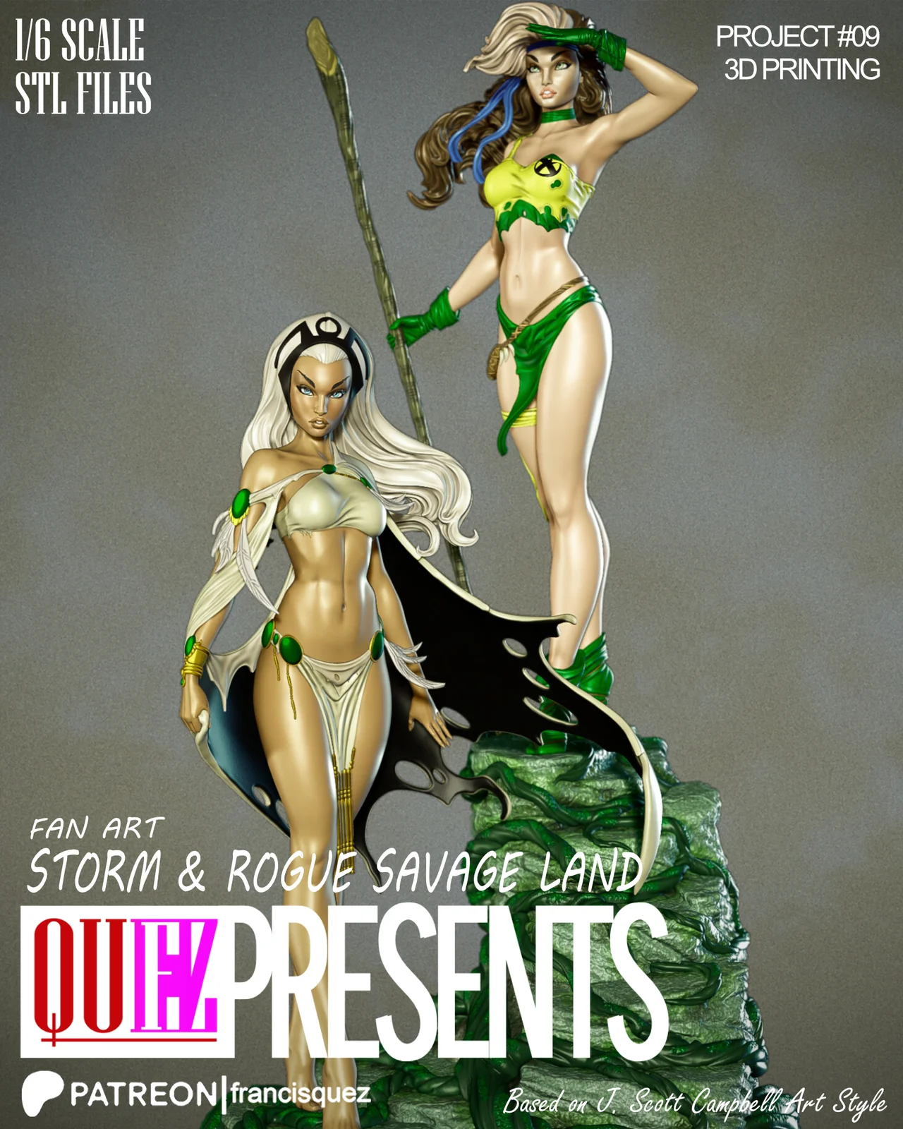 A 1/6 scale digital 3D model featuring Storm and Rogue in their Savage Land designs, based on the artwork of comic book artist J. Scott Campbell. The sculpture stands approximately 300mm (12 inches) tall and is specifically optimized for 3D printing. The geometry is provided in STL format.