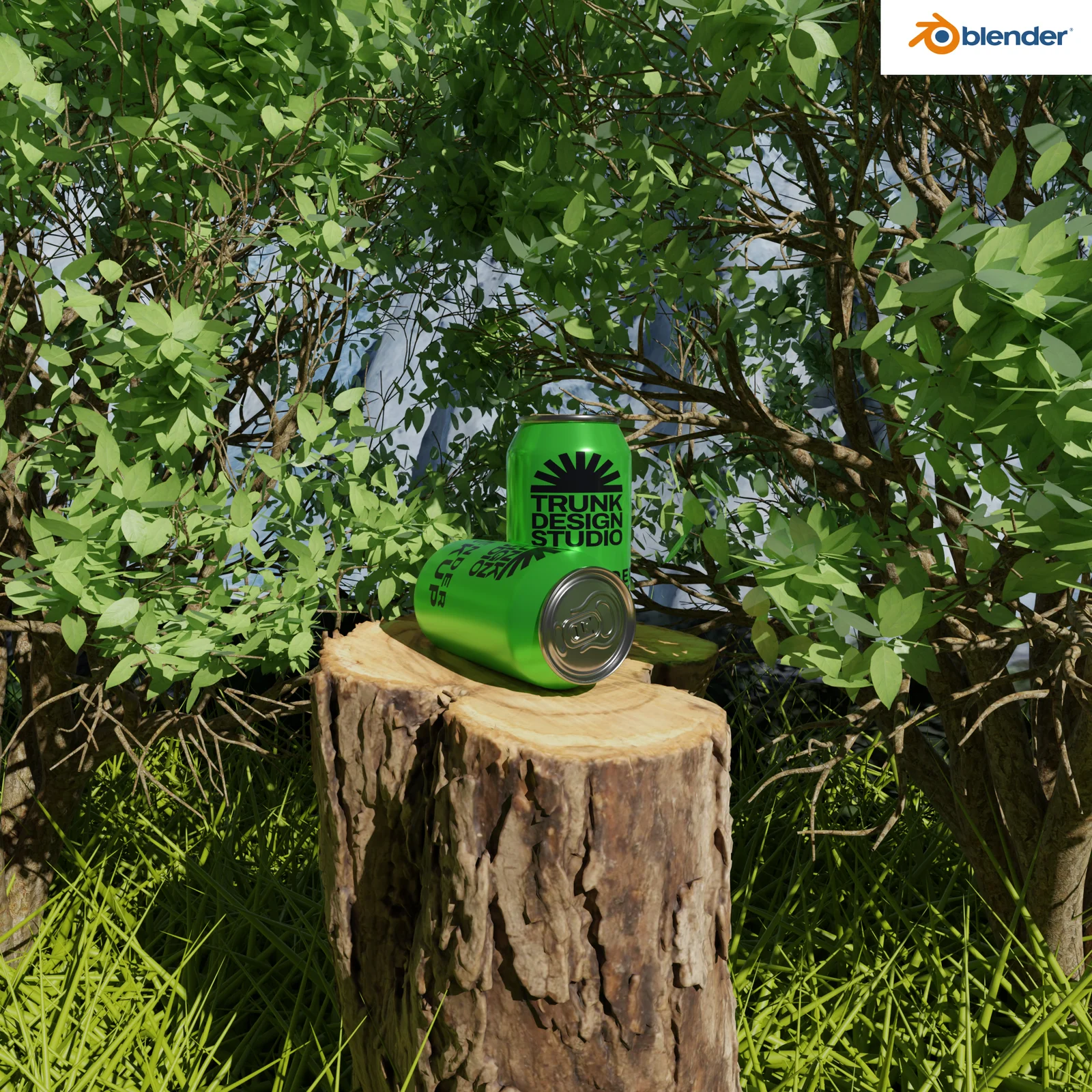 A render-ready 3D scenery mockup of a juice can designed for presenting custom packaging. The provided Blender file is pre-configured with sun lighting and a square 2000x2000 pixel camera resolution. Users can swap out the default label with their own artwork using a designated input within the Geometry Nodes modifier.