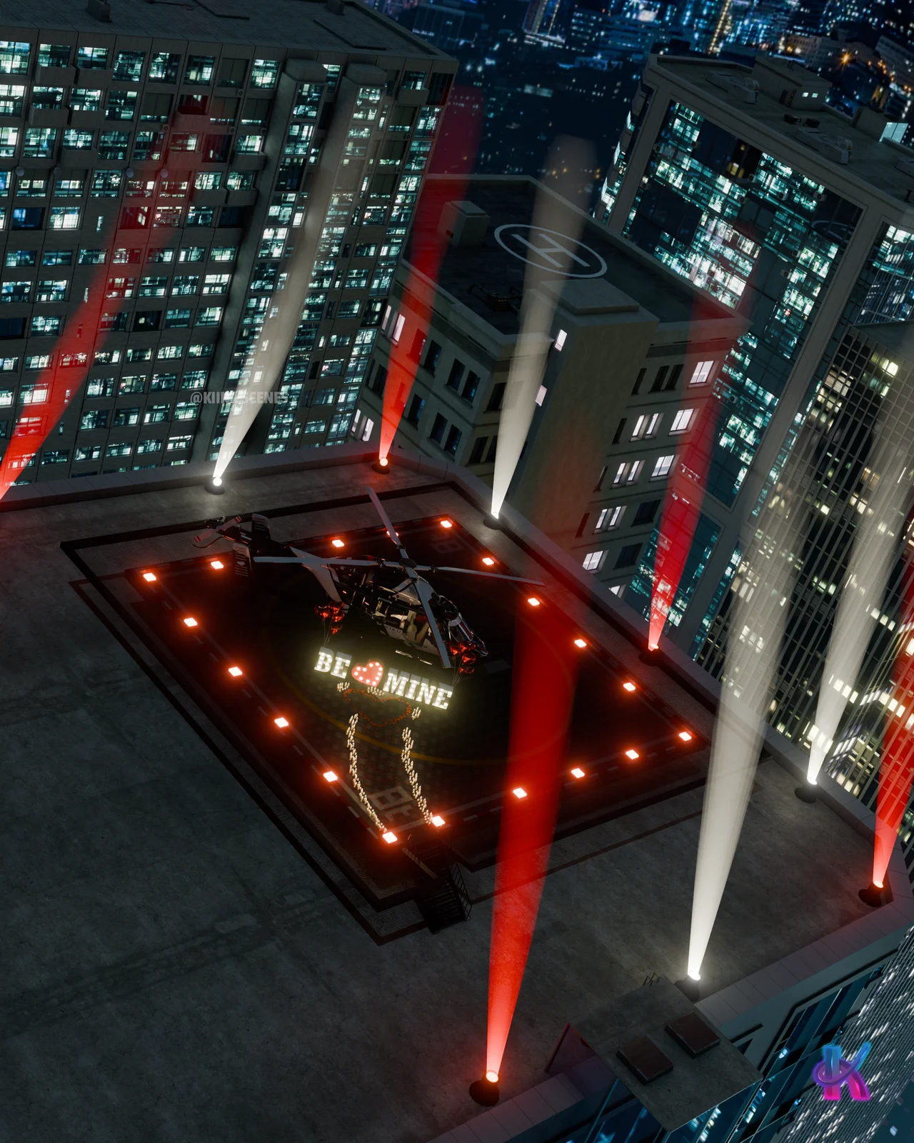 A 3D environment scene of a heliport prepared for Blender. The setup includes various 3D models and textures, configured for rendering in both the Cycles and EEVEE render engines.