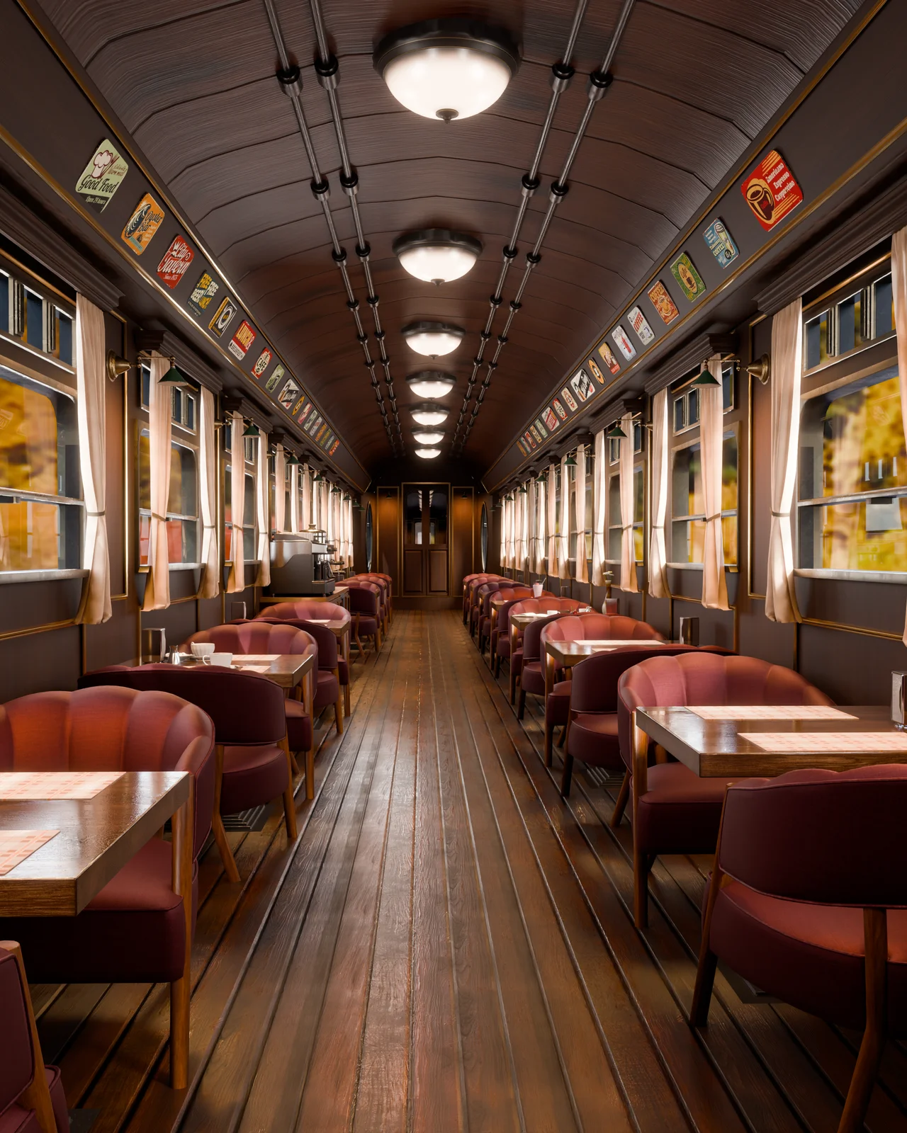 A pre-made cafe wagon scene designed for Blender 4.5. The file includes a complete environment setup with integrated 3D models and textures. It is compatible with both Cycles and Eevee render engines, with Cycles being the recommended choice for optimal results.