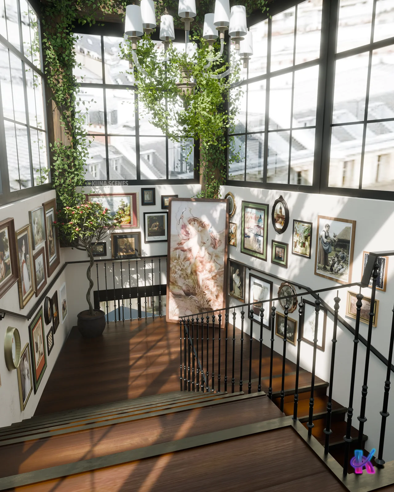 A complete interior scene for Blender depicting the Pink Mamma stairs, a recognizable architectural location. The environment includes lighting setups configured for rendering, with support for both Cycles and EEVEE render engines, though Cycles is recommended by the creator. The provided Blender file is 199 MB and contains a mix of original models and curated assets.