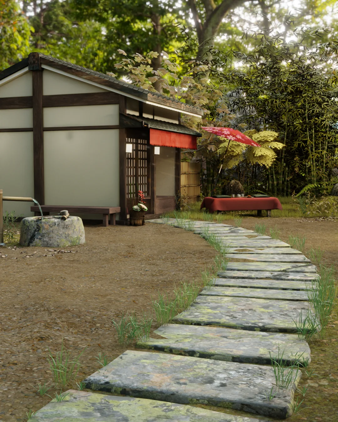 This is a complete 3D scene of a Japanese roadside teahouse built for Blender 3.6. The environment includes a mix of custom-modeled assets and CC-attributed 3D models and textures. The scene is configured to render in both the Eevee and Cycles render engines. Some exterior plant elements are hidden in the viewport but appear in the final render.