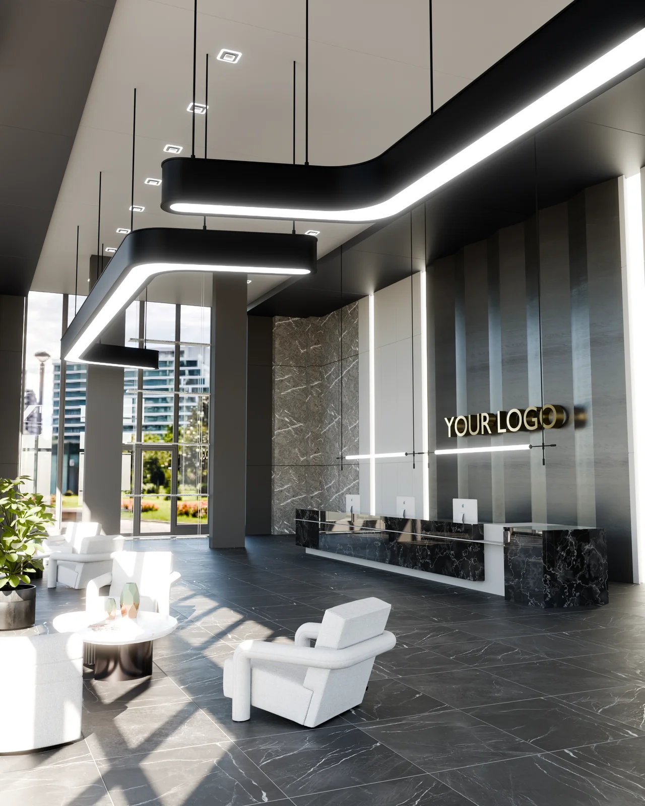 An interior office lobby environment scene assembled for Blender. The file contains a complete scene setup including various 3D models and textures. It is configured to render using both the Cycles and EEVEE render engines.