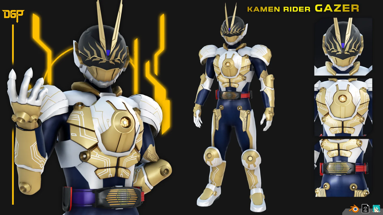 This product provides a 3D character model of Kamen Rider Gazer. The asset is delivered in multiple formats, including native Blender files, FBX, and PMX for MikuMikuDance. The MMD model is pre-configured with normal maps for use with the NCHL2Shader 2.