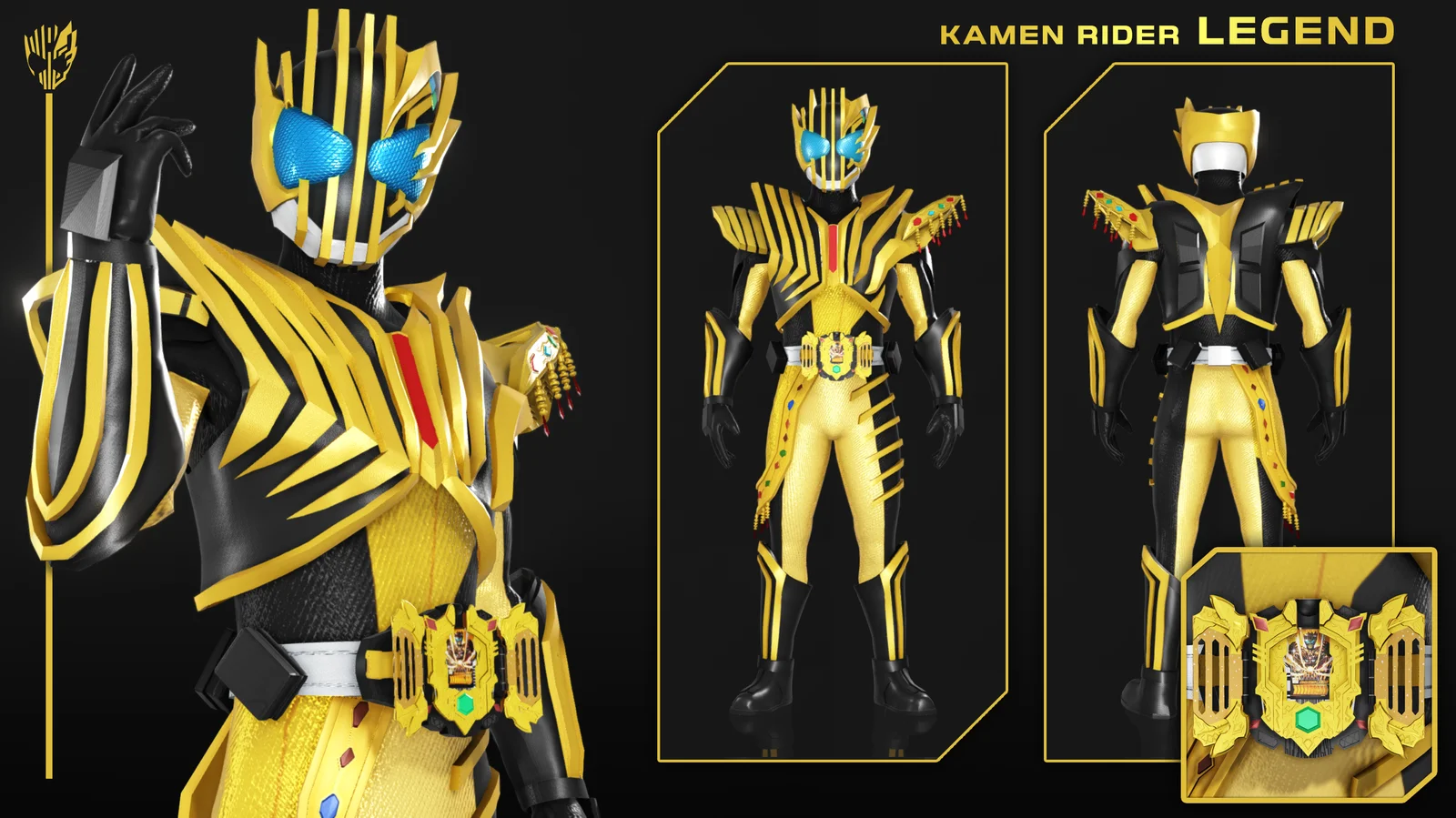 A 3D character model of Kamen Rider Legend. The package includes native Blender project files alongside standard FBX formats. It also provides PMX files configured for MikuMikuDance, complete with specific materials designed for MMD Raycast shaders and normal map applications for NCHL2Shader 2.