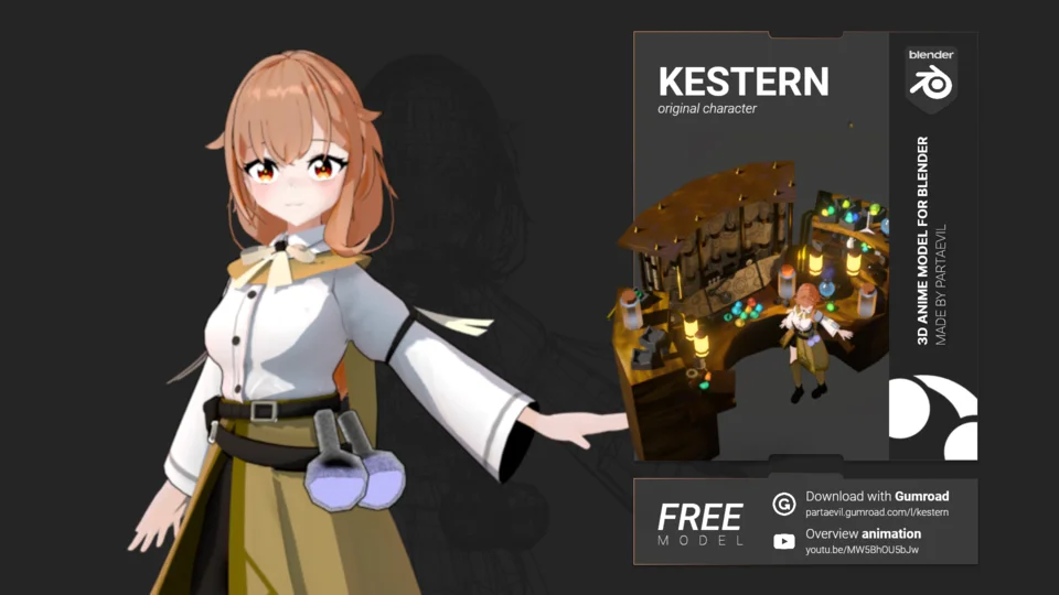 Kestern is an anime-style 3D character model of an alchemist girl. The character is rigged using Blender's Rigify system, making it ready for posing and animation. The model features customizable facial expressions and outfit details including ribbons, though some extreme poses may require manual adjustment of the ribbon positioning.
