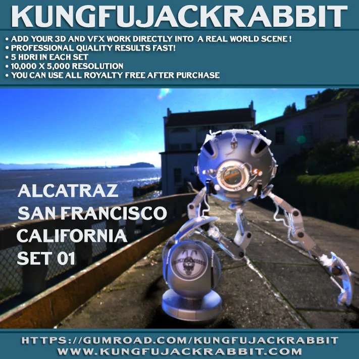 This pack contains five high-resolution HDRI maps captured at the Alcatraz prison facility. Each environment map is provided in the latitude-longitude format with a minimum resolution of 10,000 by 5,000 pixels. The images provide 360-degree backdrops, reflections, and global illumination data for establishing scene lighting.
