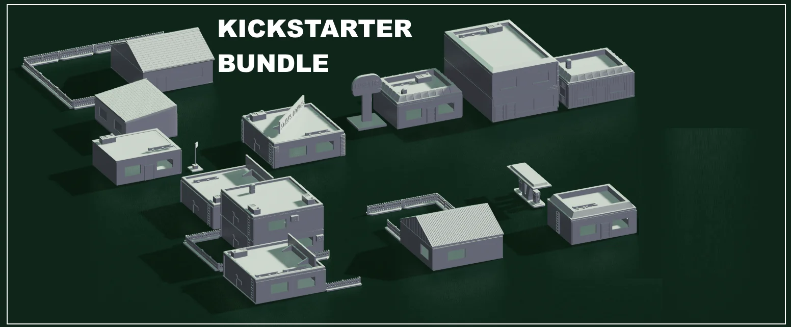 This bundle provides a modular system of modern building models designed specifically for FDM 3D printing. The collection features a flat-printing, support-free format where walls connect using a channel system, complete with interchangeable floors and removable roofs. Included are five building sizes with various texture options, spanning 1/100 and 1/72 scales.