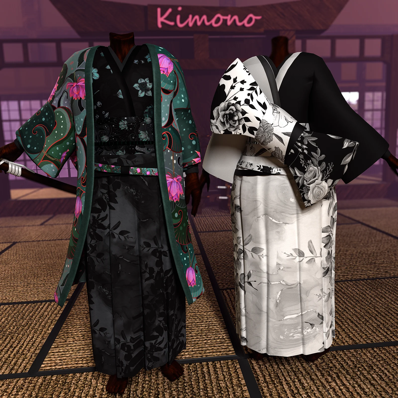 A collection of 3D kimono garments designed for masculine and feminine character bases. The set includes a bow, belt, shirt, pants, yakuta, kimono, and skirt, all modeled with quad topology. The meshes are UV mapped, rigged, and weight-painted for compatibility with Blossoms Base and Zinpias Fit Base. Multiple texture sets are provided, including floral patterns, plain colors, and themed variations. The garments are prepared for physics simulation on the sleeves and skirt.