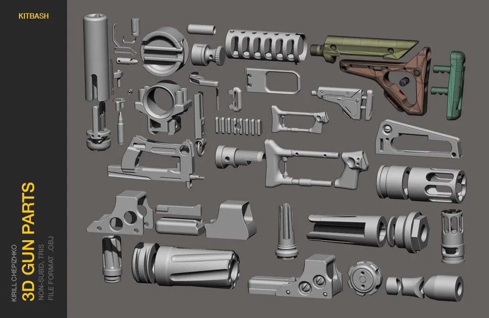 A kitbash collection containing 52 decimated, non-subdivision gun parts in OBJ format. The set includes a mix of sci-fi and realistic components designed for detailing weapon concepts. The parts are provided as format-agnostic geometry that can be imported to create custom brushes or directly placed in a scene.