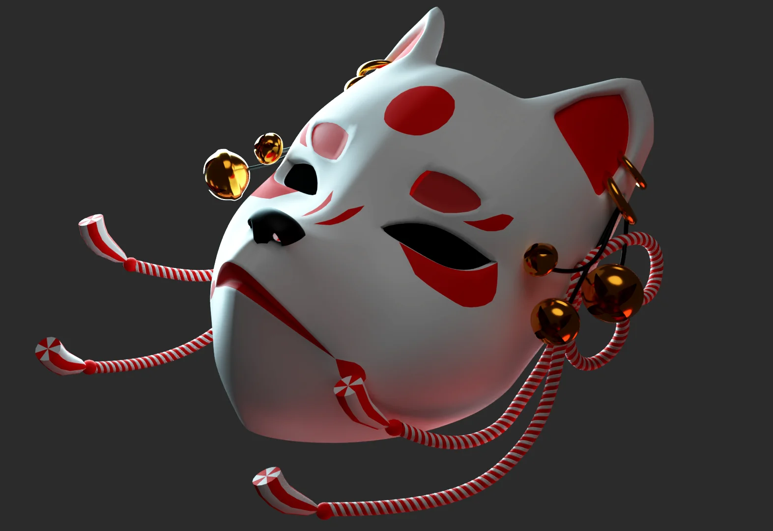 A 3D printable model of a kitsune mask optimized for FDM filament printers. The geometry features integrated side holes for attaching elastic bands and incorporates eye holes positioned along the eyebrows to create a specific fox-like proportion when worn.