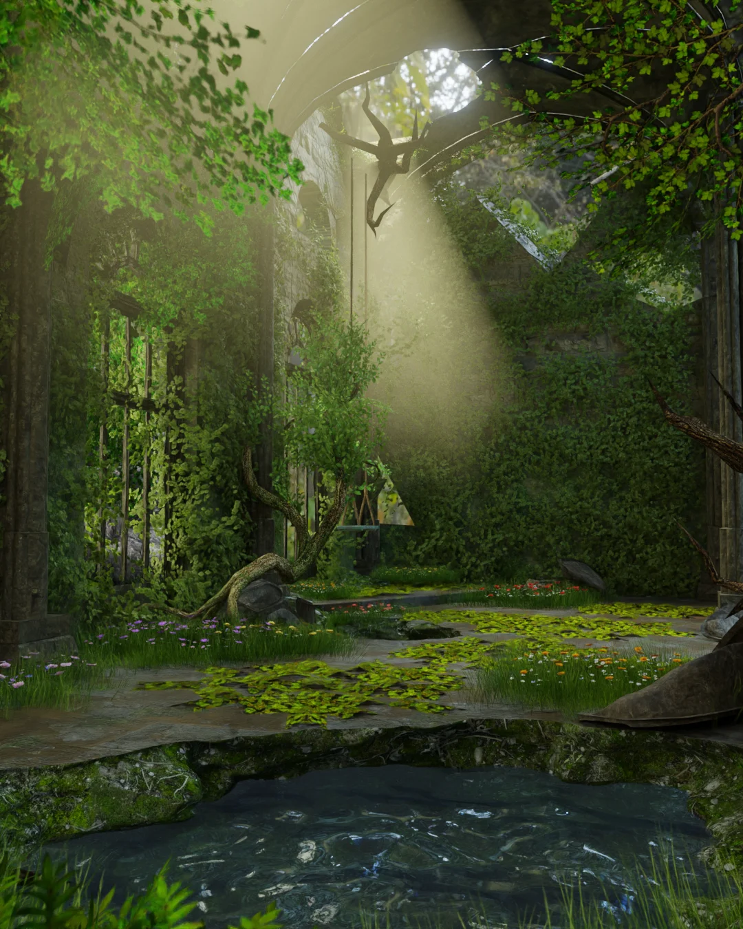 A pre-configured forest environment scene designed for Blender. The project file includes various 3D models and textures assembled to create a natural woodland setting. The scene is fully set up for rendering and includes lighting configurations compatible with both the EEVEE and Cycles render engines.