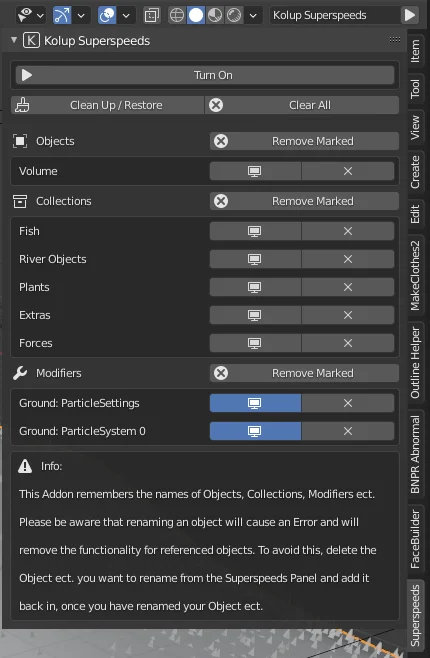 Kolup Superspeeds is an add-on that allows users to group various scene elements, such as objects, collections, modifiers, particle systems, and simulations, to hide or disable them with a single click. This workflow is designed to improve real-time viewport playback performance, particularly during animation tasks where focusing on a specific model without background computational overhead is necessary. The tool is accessed through a dedicated tab in the 3D Viewport's N-Panel, which provides an interface for managing these visibility groups.