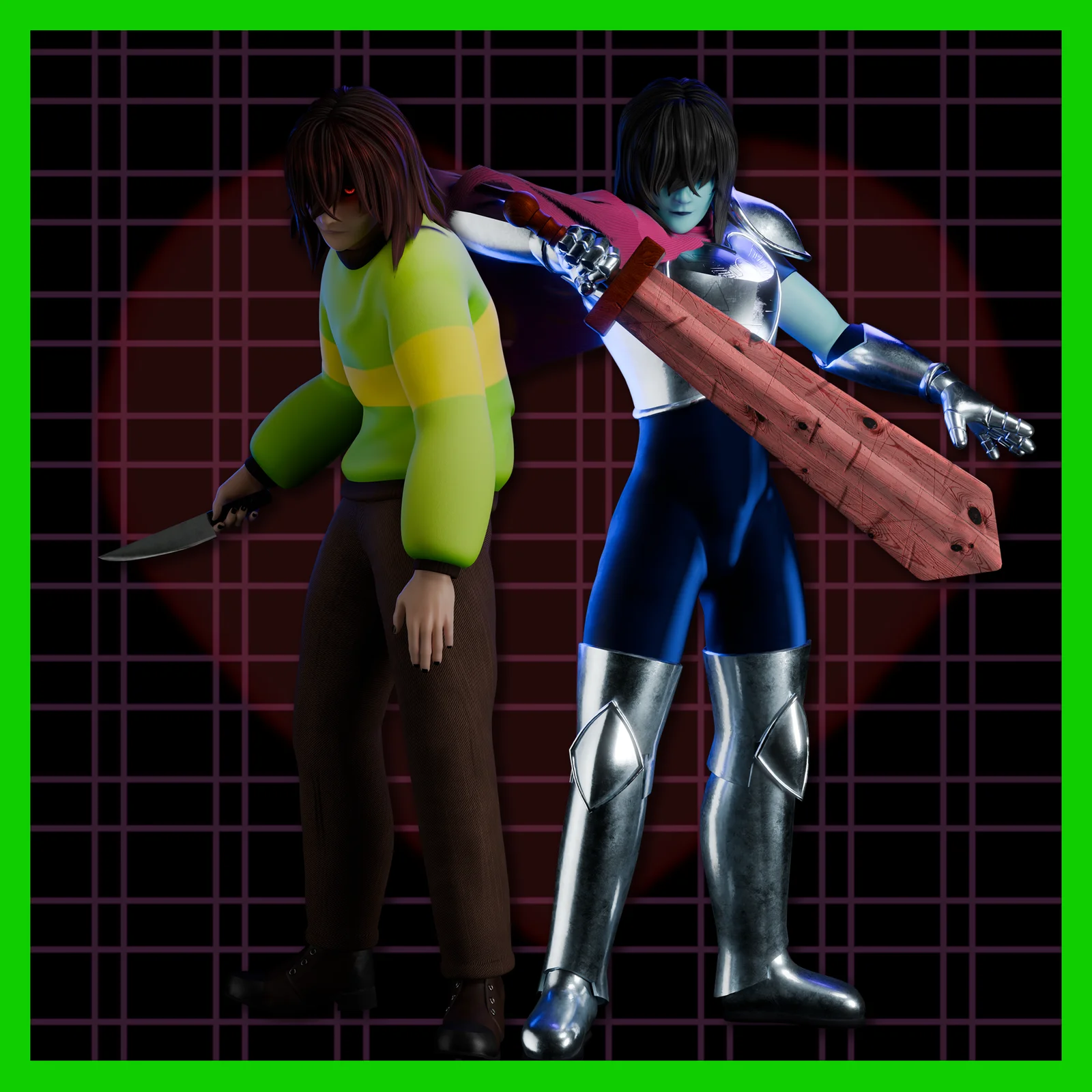 A fully rigged 3D character model of Kris Dreemurr from Deltarune, designed for use in Blender. The model is set up for animation and rendering, featuring a specialized eye shader and mesh structure. Alongside the Blender file, the package includes the original Substance Painter project, allowing for texture modifications and custom material creation.