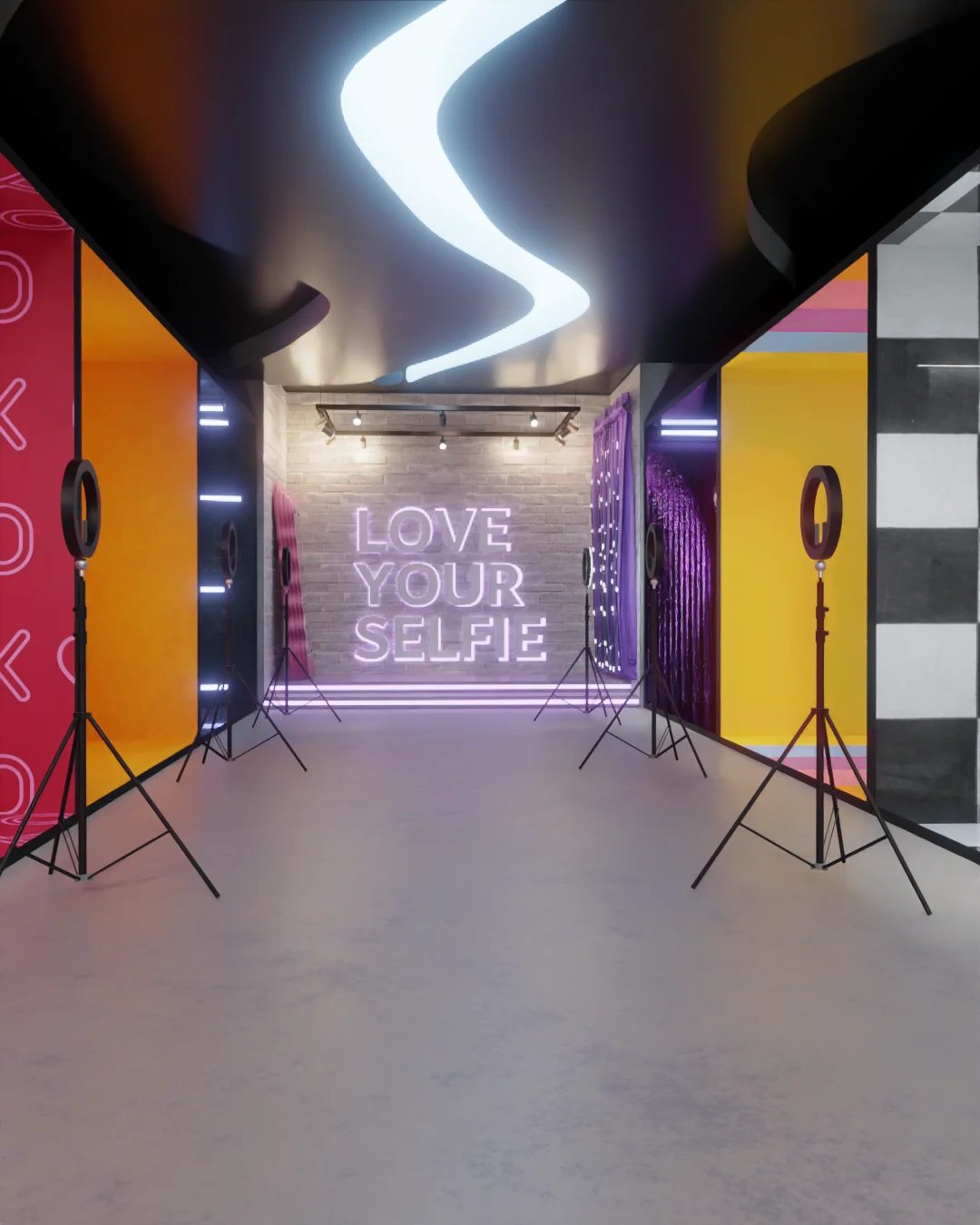 A pre-built selfie booth environment scene for Blender. The project file includes 3D models, textures, and lighting configurations. It is set up and optimized for rendering in both the Eevee and Cycles render engines, providing a ready-to-use backdrop for character or product renders.