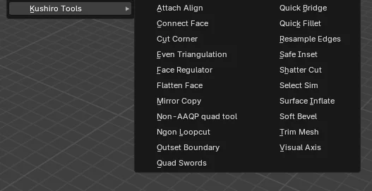 Kushiro Tools is a consolidated collection of free modeling and utility addons developed by Kushiro. It packages all of the developer's non-experimental free tools into a single installation, making them accessible through a centralized two-column pop-up submenu.