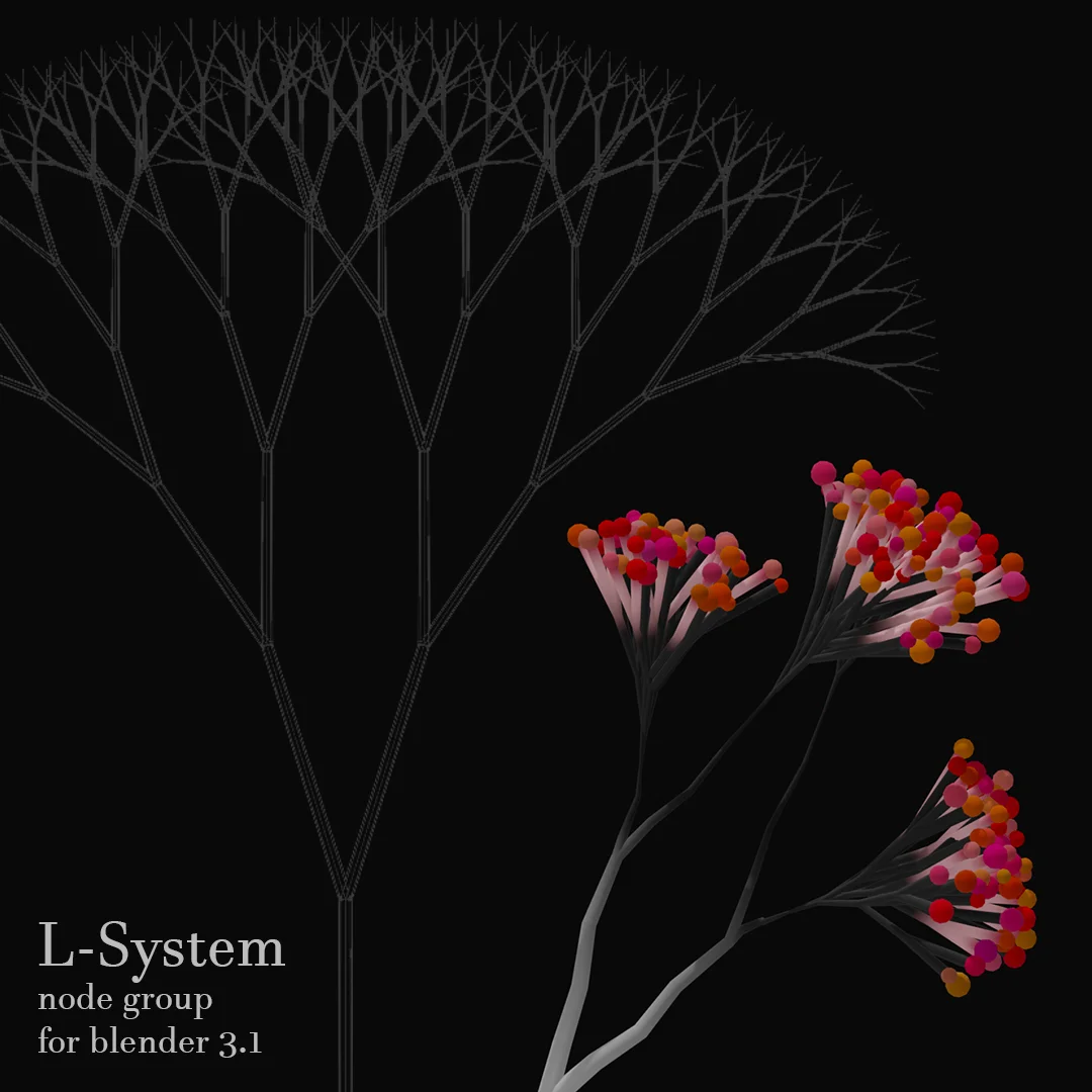 This Geometry Nodes setup provides a procedural L-system generator for creating plants, trees, and branching structures in Blender. The node group outputs a curve object, a 0-1 curve factor for controlling thickness, and an endpoint selection mask for instancing objects at the tips of the branches. The system is built with a default limit of 12 iterations to prevent performance issues, though users can manually expand this limit within the node tree.