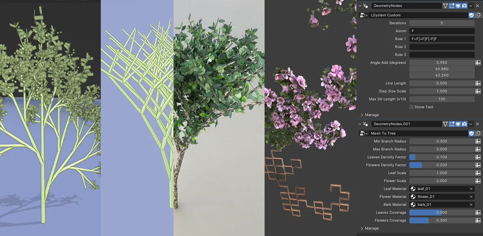 The setup operates through geometry node modifiers applied to any mesh object. Users can define custom logic with the core system or utilize included preset modifiers that immediately output recognizable shapes. Parameters such as iteration count and step size allow for quick variation, though heavy iterations will naturally impact processing performance.