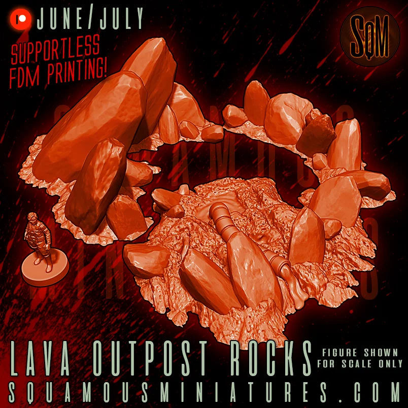 A collection of 3D printable volcanic rock models designed for tabletop gaming and scaled for 35mm miniatures. The assets depict large volcanic bombs and cleared areas featuring tapable lava pools. Supplied as standard STL files, these models are specifically oriented and optimized for supportless FDM printing, tested for compatibility with 180mm x 180mm print beds.