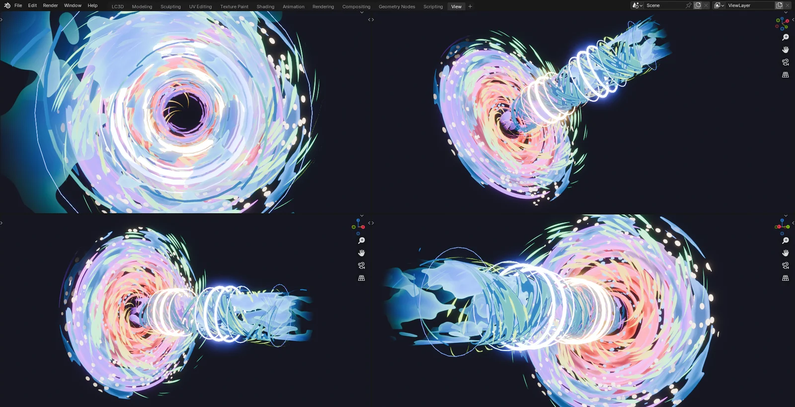 This Geometry Nodes setup generates stylized energy beams in Blender. The effect provides parameters to customize the shape and behavior of the beam, and includes a procedural shader group to control the visual properties of the energy.